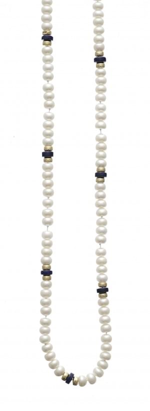 3128. Collier de perles d'eau douce ponctué de motifs en or et en lapi...