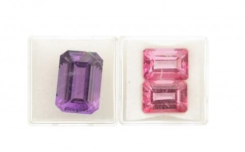 3162. Lot de trois pierres taille rectangle sur papier, une améthyste...