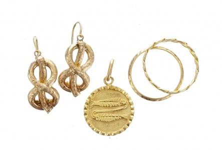 3208. Lot de deux anneaux, une médaille du signe des poissons et une p...
