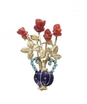 3241. Broche à motif de pot de fleurs en corail et sertie de turquoise...