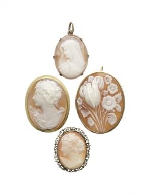 3255. Ensemble de deux camés sur coquillage, l'un à décor de fleurs et...