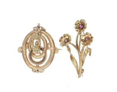 3293. Lot de deux broches, l'une à motif de fleurs serties de rubis