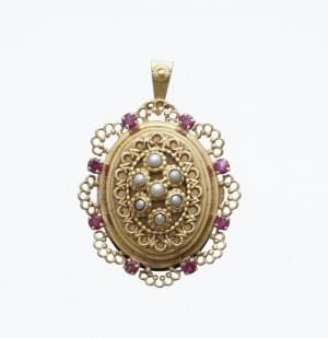 3302. Pendentif porte-photo ovale serti de demi-perles et de rubis