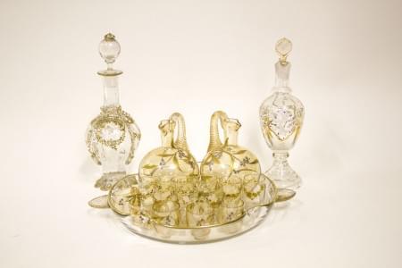 3437. Ensemble de 4 carafes, 13 petits verres et 1 plateau à décor éma...