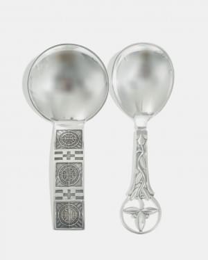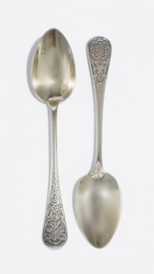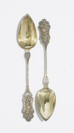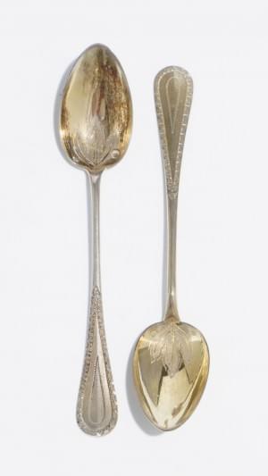 3460. 2 cuillères à feuilles de thé à décor végétal et géométrique, Da...