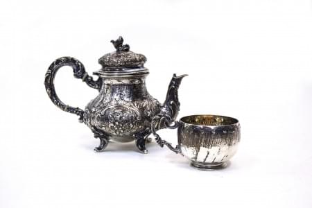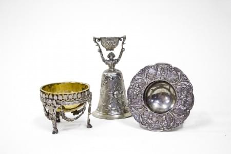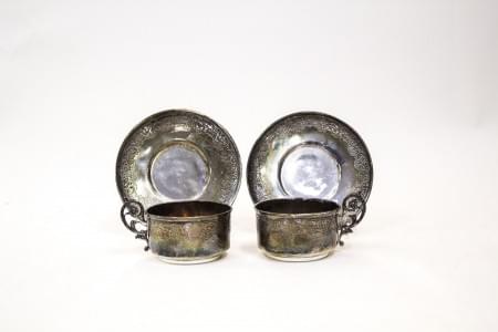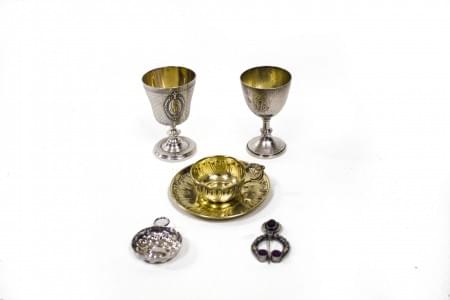 3482. 2 coquetiers, tasse de poupée, taste-vin miniature et broche