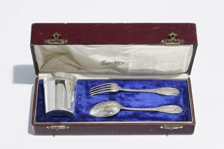 3491. Set de baptême comprenant une timbale à frise de feuilles d'eau...