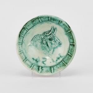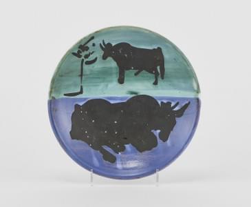 Assiette toros, 1952, terre de faïence blanche, décor aux engobe...