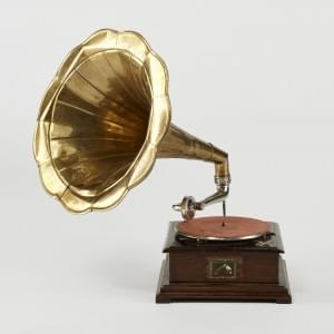 Bois et laiton. On joint un ensemble de disques en vinyl, 66x33...