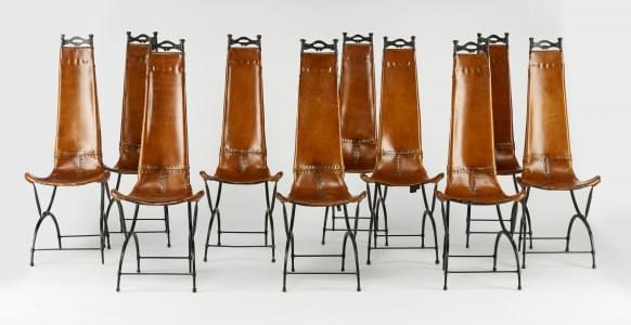 Dix chaises à haut dossier, fer forgé et cuir, H 127 cm