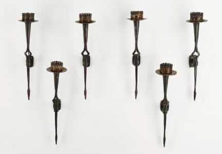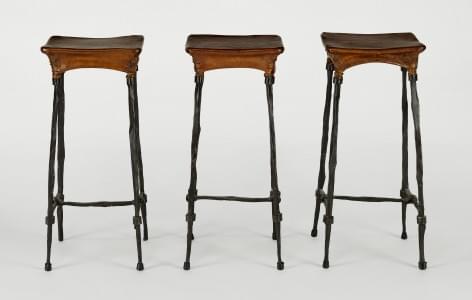 Trois tabourets, fer forgé et cuir, H 79 cm