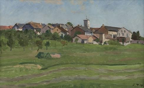 Vue d'un village, huile sur pavatex, cachet de l'atelier au dos,...