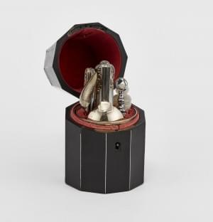 Ecrin en poirier noirci, comprenant: timbale, fourchette, cuillè...