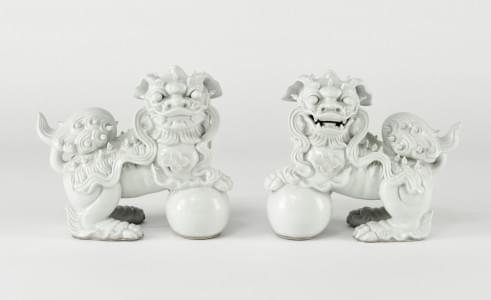 Porcelaine émaillée bleu banc à décor de chiens de Fô, H 29 cm