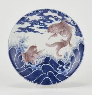 Porcelaine émaillée bleu et rouge à décor de poissons, D 39 cm
