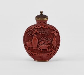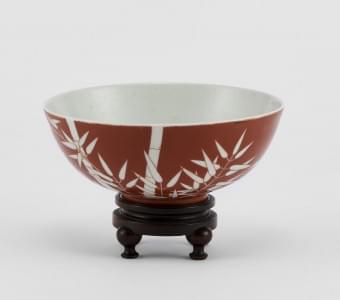 Porcelaine à décor de feuilles de bambou sur fond rouge corail,...