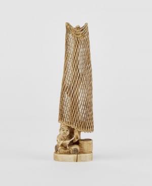856. Okimono figurant un enfant assis adossé à un arbre tenant un fil...