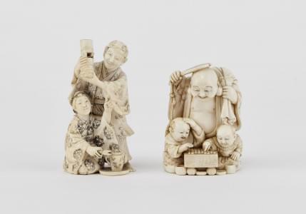 862. Deux okimono, un figurant Budai et deux enfants et l'autre figur...