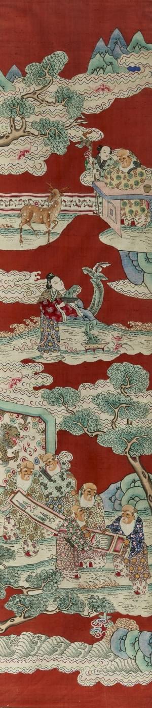 Gouache à décor de guanyins et immortels sur fond rouge et blanc...