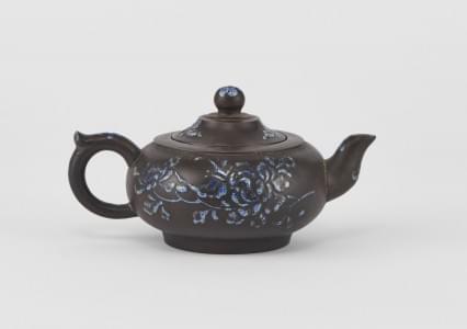 Grès chocolat à décor de fleurs émaillées en bleu, L 12 cm