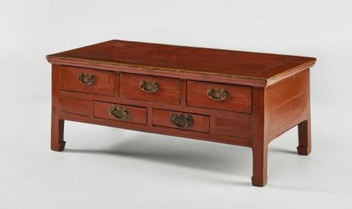 Soie à décor de dragons et rinceaux sur fond rouge, 130x260 cm