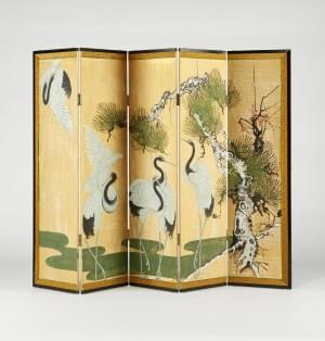 Gouache et or sur papier à décor de grues, 160x200 cm