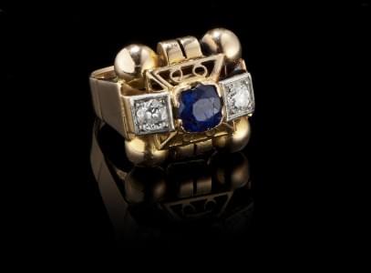 100. Bague sertie d'un saphir épaulé de deux diamants taille ancienne
