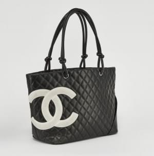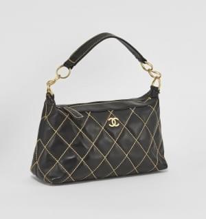 Cuir lisse noir matelassé de fil beige, intérieur en toile noire...