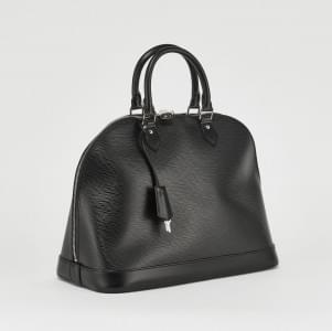 Cuir épi noir, intérieur en daim gris, garniture en métal argent...