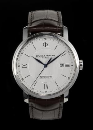 Cadran argenté, aiguilles bleues, chiffres romains noirs, milieu...