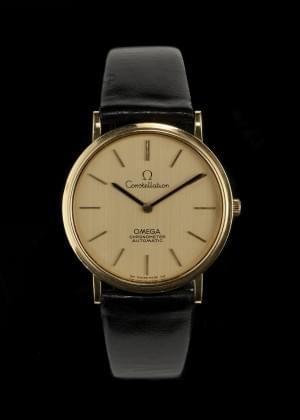 Cadran noir, aiguilles dorées, chiffres arabes et index bâtons d...