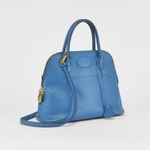 Cuir grainé bleu canard, garniture en métal doré, 24x33x13 cm