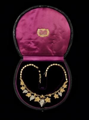 96. Collier tour de cou à décor de pampres de vigne serti de perles,...