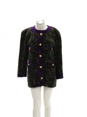 Fourrure à motifs verts sur fond beige bordé de fourrure violett...