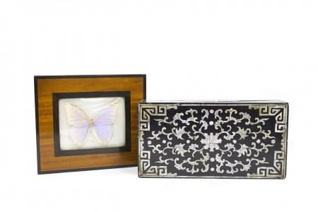 4105. Deux boîtes, l'une ornée d'un papillon, l'autre en nacre et bois...