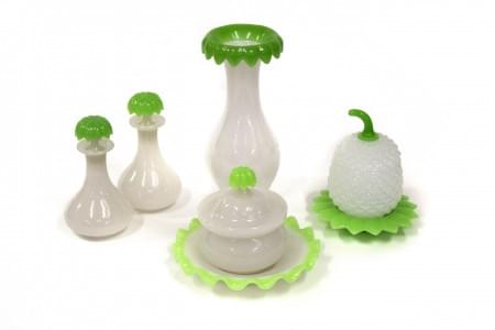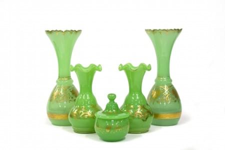 Opaline verte à décor doré de rinceaux, H 14 à 32 cm