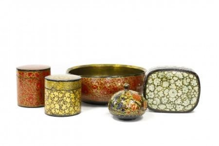 4112. 4 boîtes et 1 jatte à décor de fleurs rouges blanches et or sur...