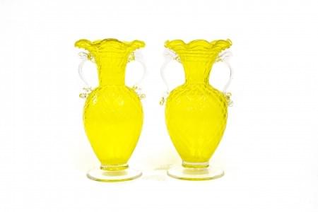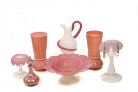 4179. Paire de vases tulipes, 1 vase évasé, 1 bonbonnière, 4 assiettes...