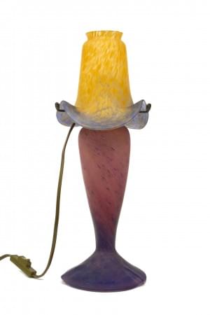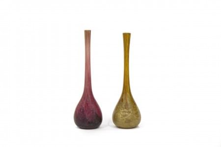 Verre multicouche dégagé à l'acide, rose et ocre, H 16,5 et 16 c...