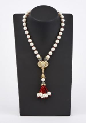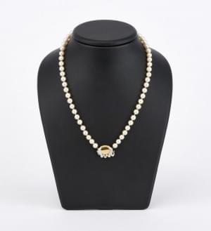 3279. Collier de perles terminé par un motif d'éléphant serti de diama...