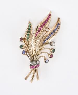 3265. Broche feuillagée sertie de saphirs, rubis, émeraudes et diamant...