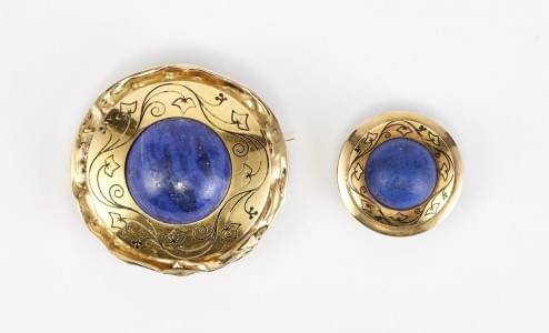 3285. Lot d'une broche et d'un bouton ciselés centrés d'un cabochon de...