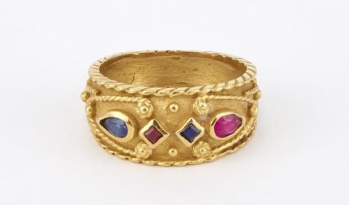 3292. Bague à décor de granulation serti de saphirs et de rubis