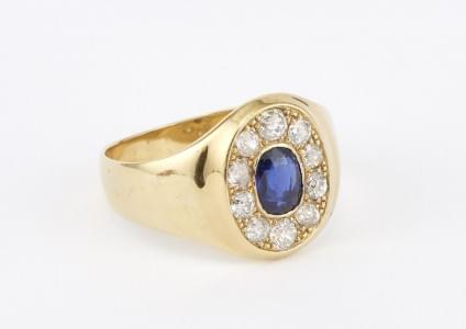 3304. Bague chevalière sertie d'un saphir taille ovale entouré de diam...