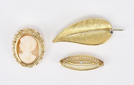3317. Lot de trois broches, l'une retenant un camée sur coquillage, la...