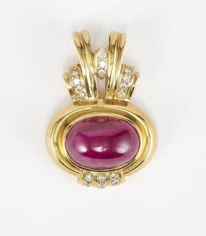 3323. Pendentif serti d'un rubis taille cabochon (env. 4 ct) rehaussé...