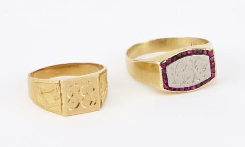 3324. Lot de deux chevalières, l'une entourée de rubis et monogrammée...