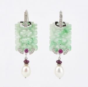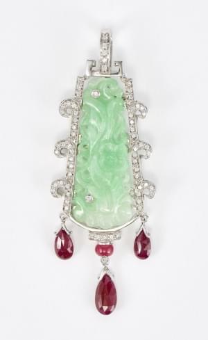 3359. Pendentif sertie d'une plaque de jade ajouré et sculpté entourée...