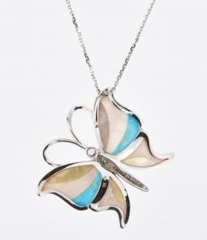 3355. Chaîne à maille forçat retenant un pendentif papillon nacré sert...