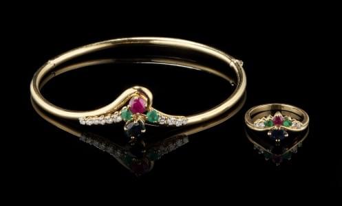 3367. Ensemble d'un bracelet jonc ouvrant et d'une bague centrés d'un...